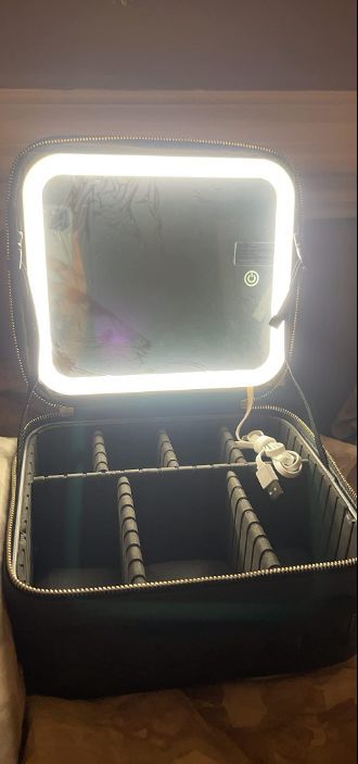 "Den beste sminkevesken når du reiser, veldig praktisk når du trenger å gjøre sminke på et sted uten speil. Jeg elsker hvor sterkt det andre og tredje lyset er. Det eneste problemet er at børstene mine er for lange til å passe i brettet, men jeg tilpasset skuffene for å passe alle børstene mine og all sminken min! Jeg tar dette med overalt og det er fantastisk!!!! 10/10"