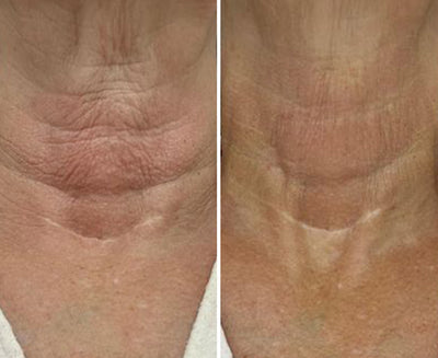 Etter at du har brukt serumene dine, påfører du en jevn mengde av stram og løft nakkekrem på halsen og brystet, og masserer med oppadgående bevegelser.