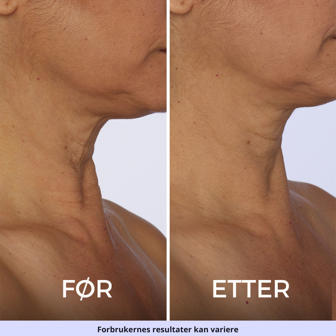Huden på halsen er tynnere og mer delikat enn i ansiktet, så den trenger spesiell, målrettet pleie. Halskremen er formulert for å ta hånd om de unike problemene på halsen og brystet, som kreppethet, slapp hud og fine linjer og rynker. *Det tar 30-60 dager før synlige resultater vises.