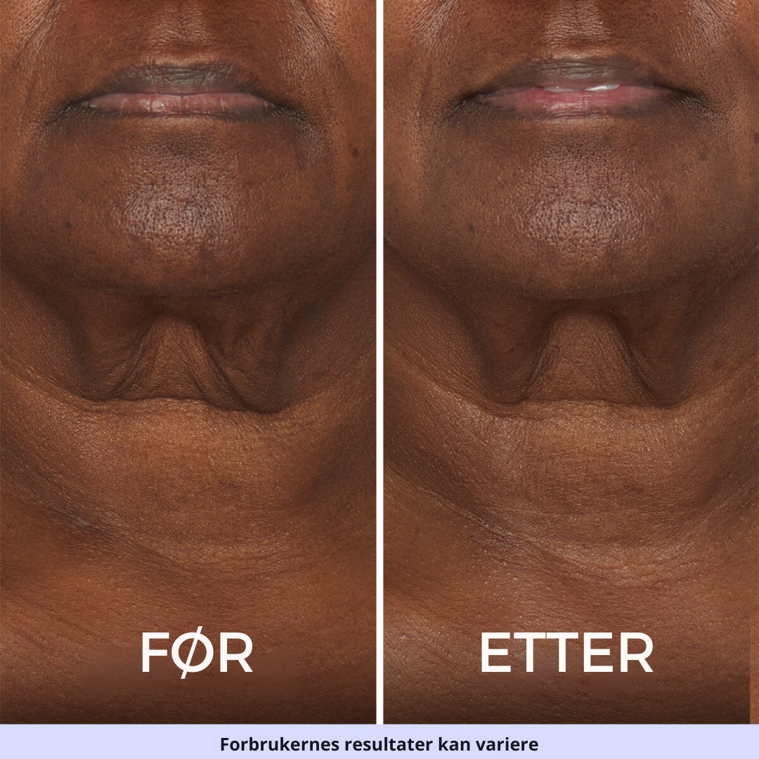 Flere klinisk dokumenterte ingredienser virker i harmoni for å redusere forekomsten av linjer, rynker og rødhet og gir en jevnere og jevnere hud på hals og bryst.